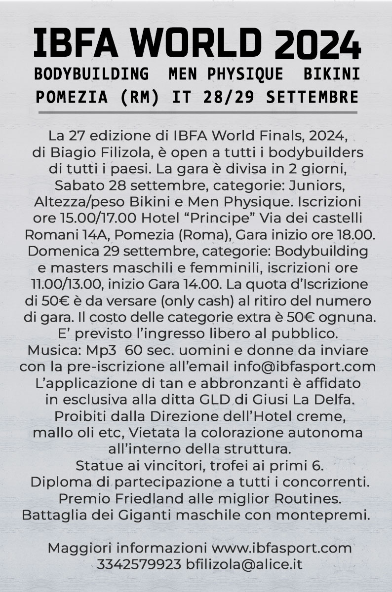 [About Us][Competitions][Hall of Fame][Affiliated][Contacts Us][IBFA DVD][Links][Corso Istruttori Bodybuilding AIC/IBFA]
